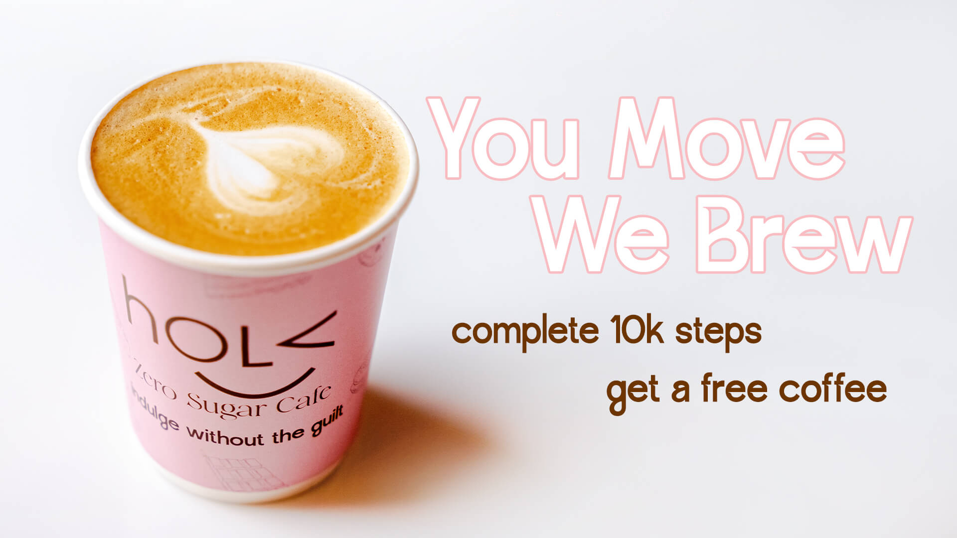 Join our #YouMoveWeBrew challenge. It’s simple math: complete 10,000 steps and show us your step count at Hola Zero Sugar Cafe, and enjoy a free coffee as a reward.